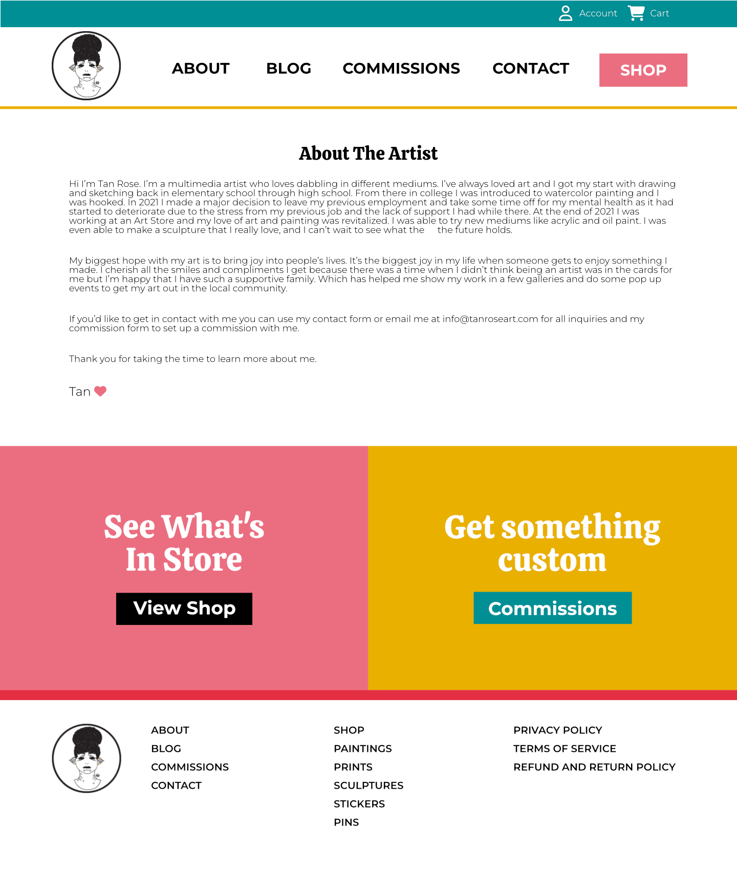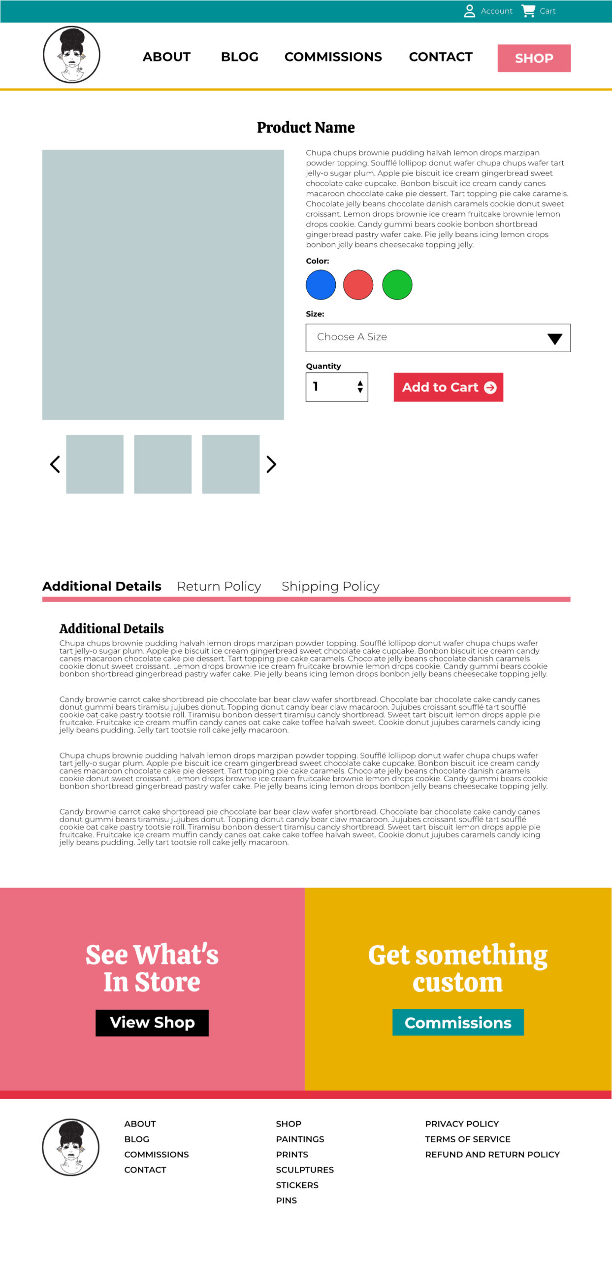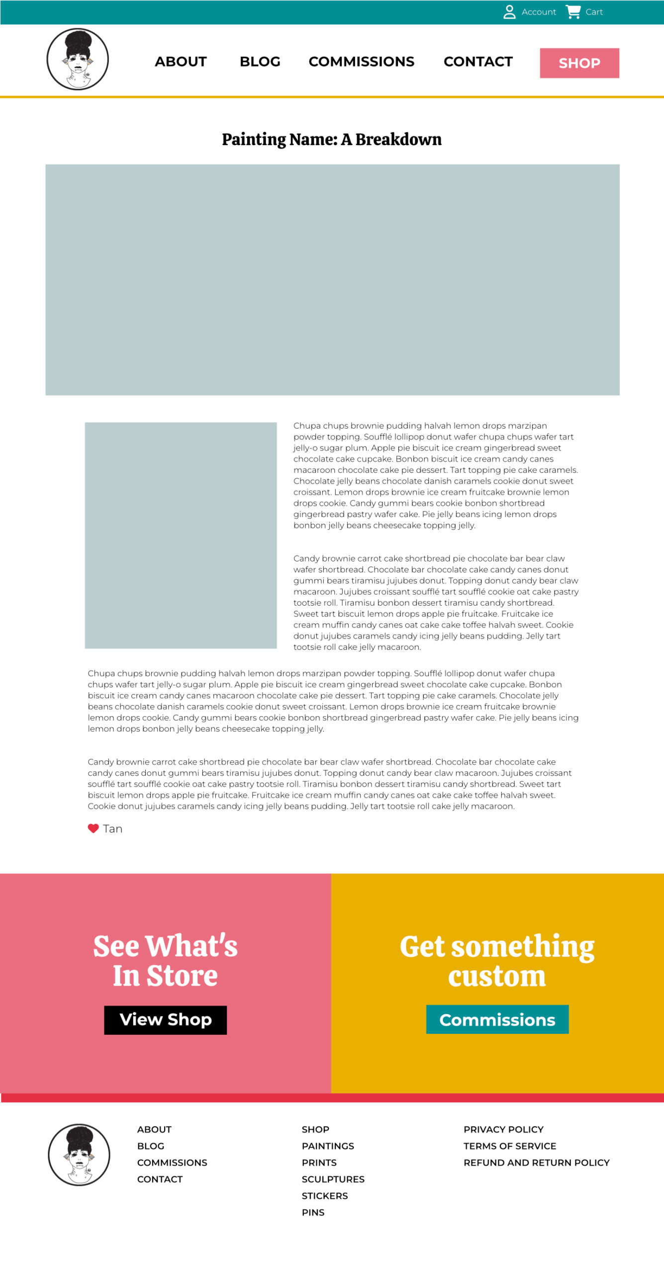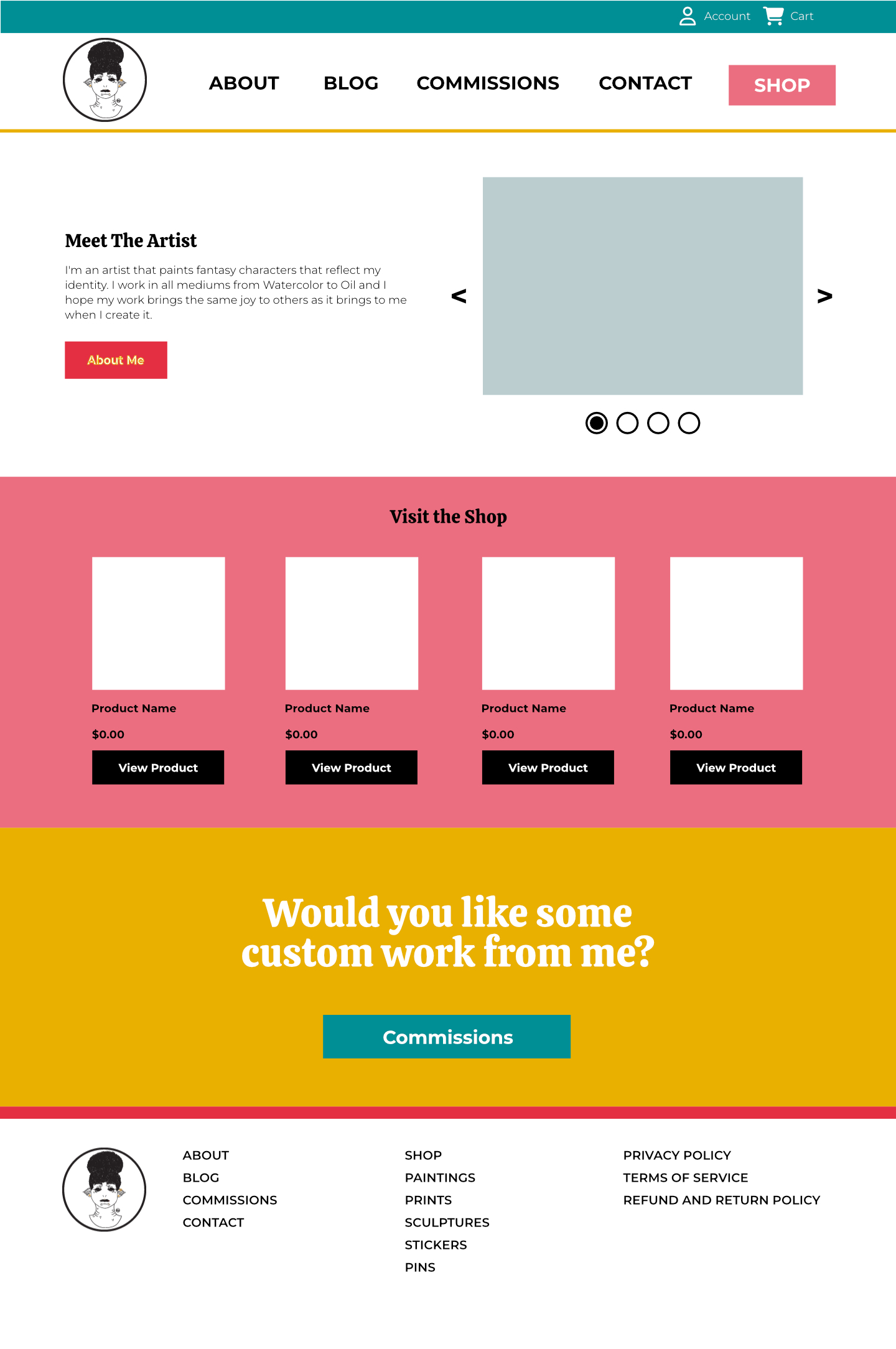 For this Project I wanted to keep the design of the site simple and open because I wanted the art to shine on the site. I used a lot of the knowledge I gained from working with a design team in the 5 years I worked at a marketing agency. The first thing I did was figure out what colors I wanted to use for the project. I wanted the site to be colorful and inviting, but not so colorful that it took away from the main subject which is art. Once I figured out the colors I wanted to work with I made a style guide to figure out what colors would be used for different elements of the site like headers and buttons. After that I worked on the homepage to figure out the different sections of the homepage and to figure out what repeating elements I’d have like the header, footer and the call to actions right before the footer.