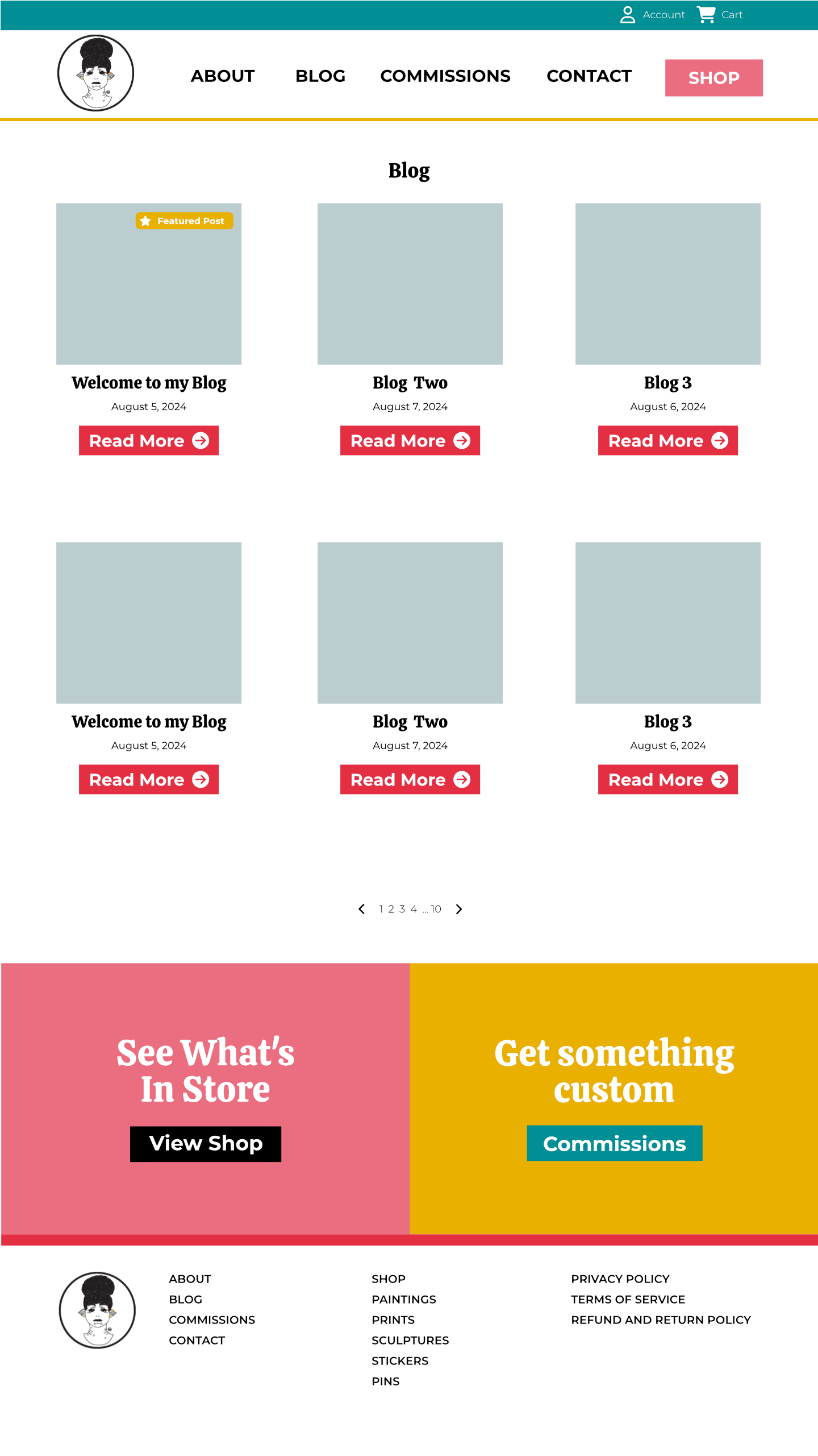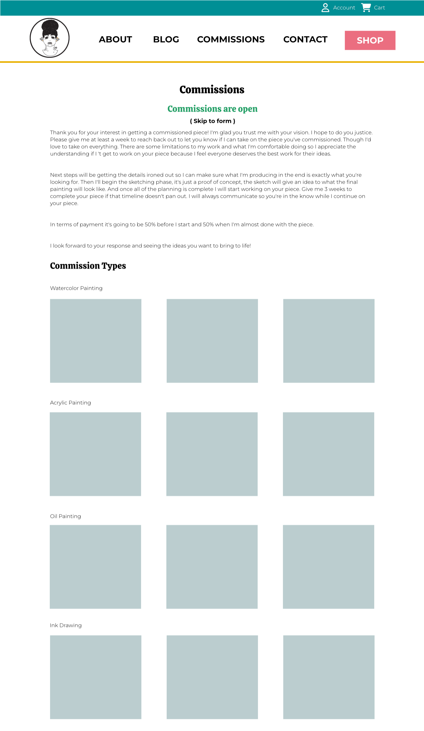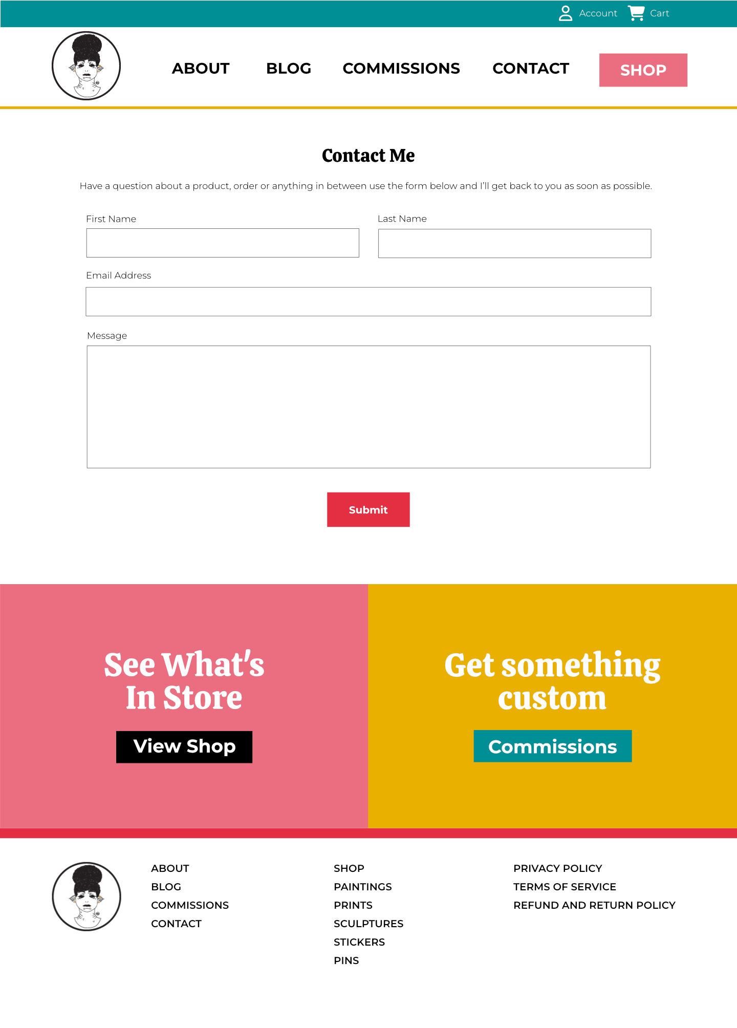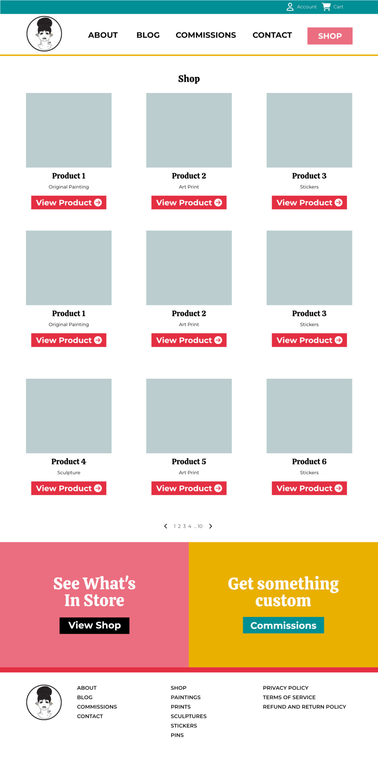 For this Project I wanted to keep the design of the site simple and open because I wanted the art to shine on the site. I used a lot of the knowledge I gained from working with a design team in the 5 years I worked at a marketing agency. The first thing I did was figure out what colors I wanted to use for the project. I wanted the site to be colorful and inviting, but not so colorful that it took away from the main subject which is art. Once I figured out the colors I wanted to work with I made a style guide to figure out what colors would be used for different elements of the site like headers and buttons. After that I worked on the homepage to figure out the different sections of the homepage and to figure out what repeating elements I’d have like the header, footer and the call to actions right before the footer.